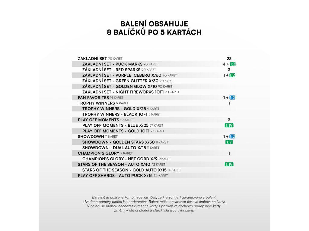 Každý Hobby box obsahuje: 23x Základní set, 4x Základní set - Puck Marks, 3x Základní set - Red Sparks, 1x Základní set - Purple Iceberg x/60, 1x Fan Favorites, 1x Trophy Winners, 3x Play Off Moments, 1x Showdown, 1x Champions’s Glory