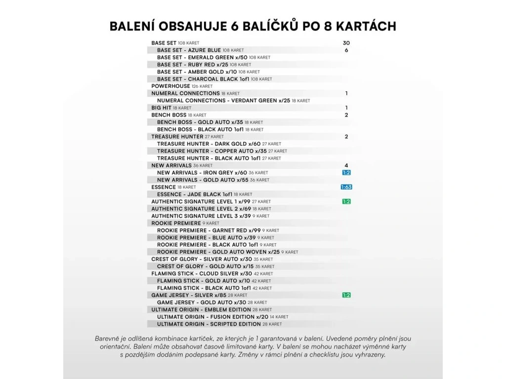 Poměr vkládaní karet do balení je podmíněn garancí obsahu v Blaster boxu, který najdete v přiloženém obrázku v náhledu produktu.