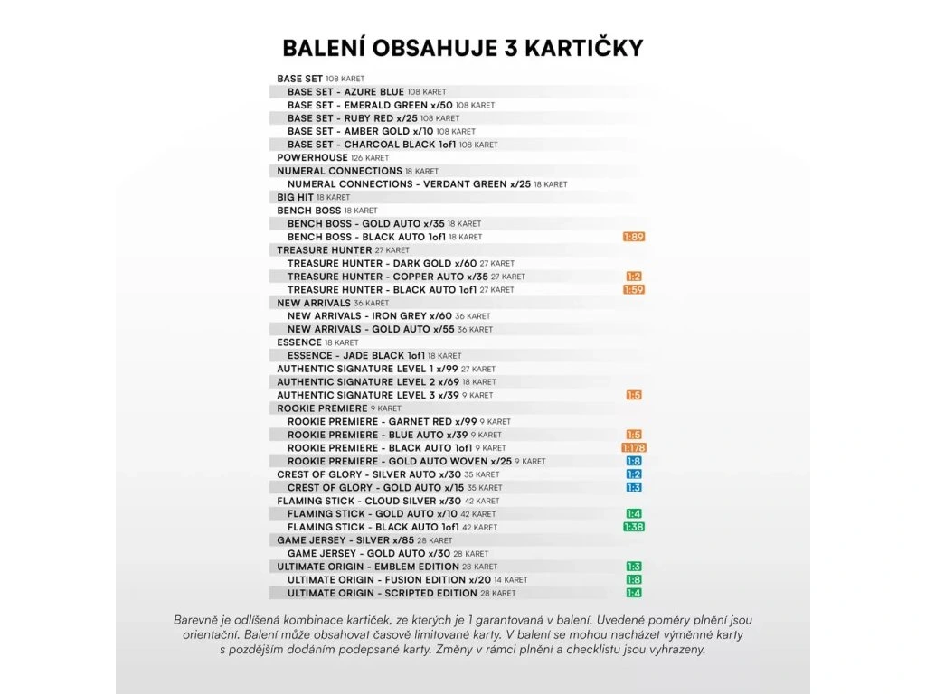 Poměr vložení kartiček do balení je podmíněn garancí obsahu v Exclusive boxu, který najdete v přiloženém obrázku.