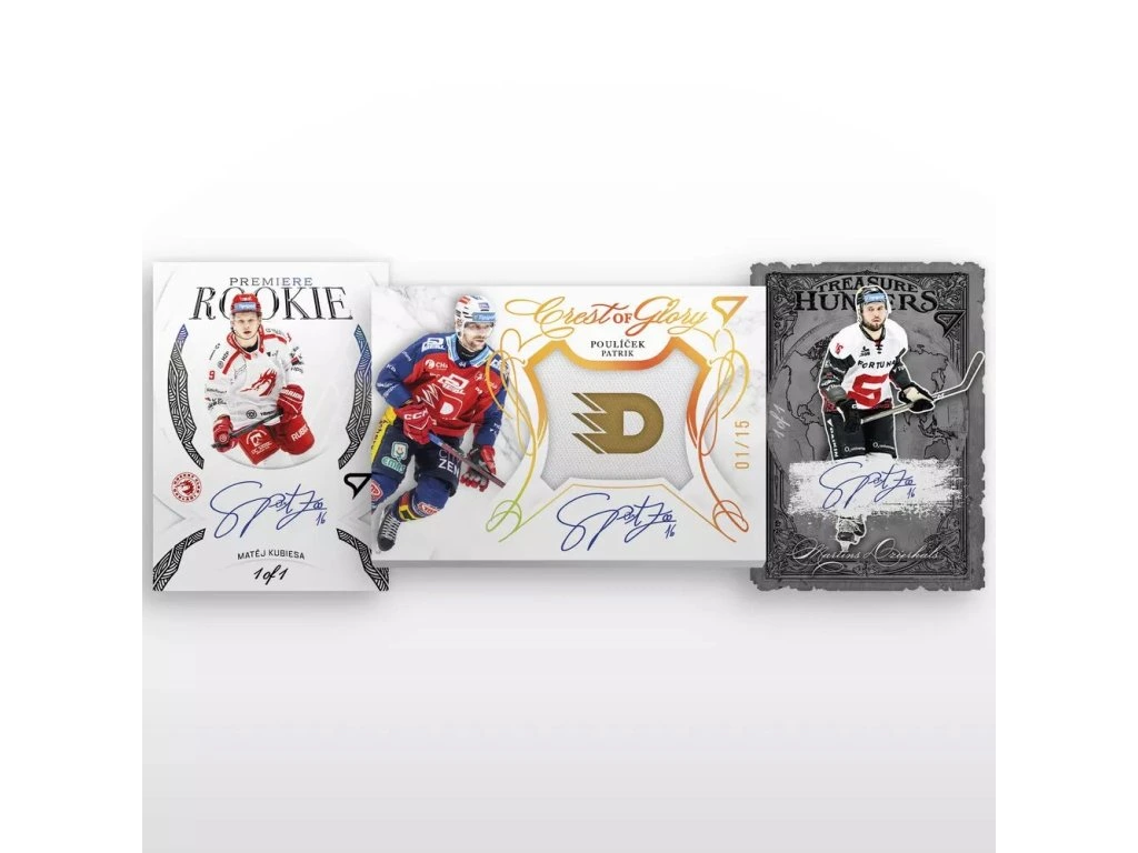- speciální podepsanou kartu s kouskem štulpny Rookie Premiere - Gold Auto Woven x/25, podepsanou kartičku s výšivkou klubového loga Crest of Glory - Silver Auto x/30 nebo Gold Auto x/15