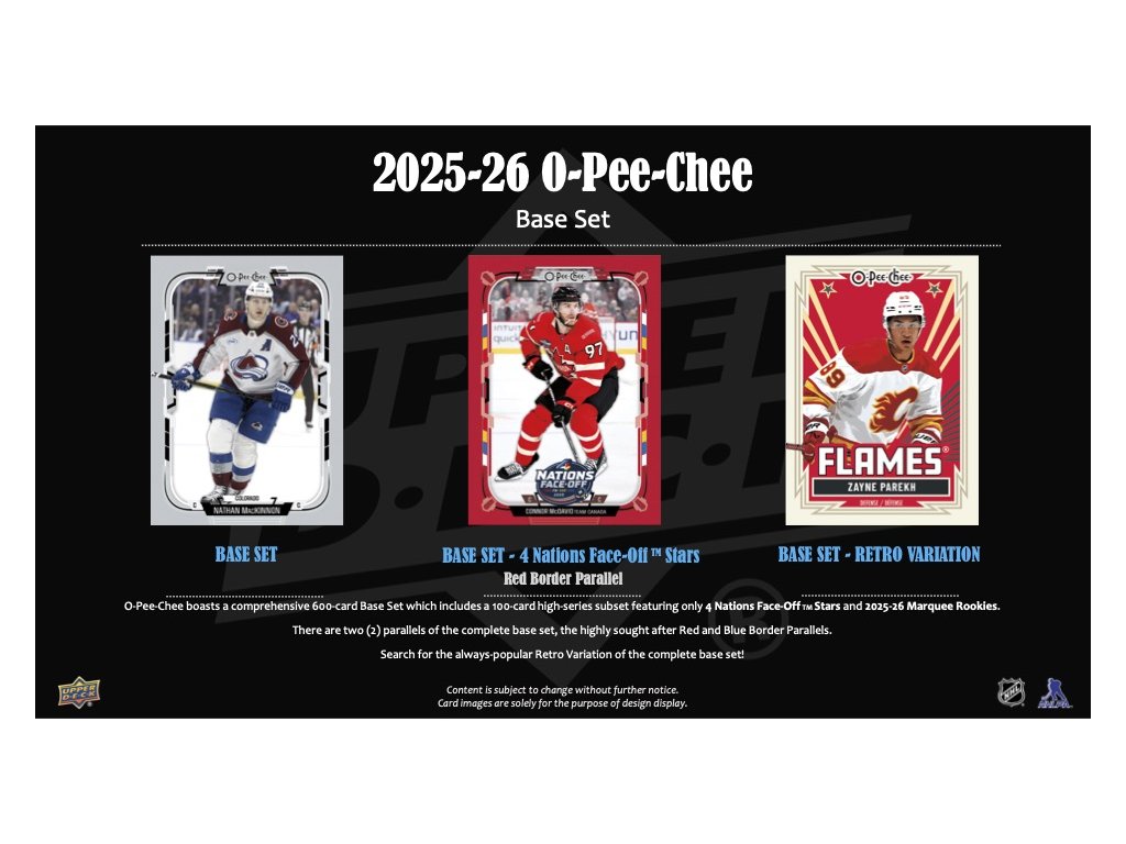 O-Pee-Chee se pyšní komplexním základním setem obsahujícím 600 karet, který zahrnuje 100 kartový highseries subset, jenž obsahuje pouze karty z 4 Nations Face-Off Stars a 2025-26 Marquee Rookie.