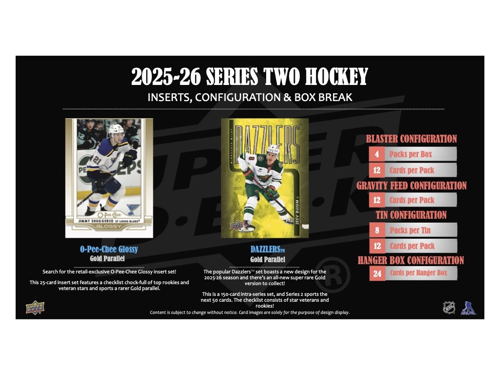 Series 2 obsahuje dalších 250 karet ze základní sady 2025-26 Upper Deck Series. Každoročně patří Series celosvětově k nejvíce sbíranému setu - a to nejenom base setu! Obsahuje 198 karet veteránů, 49 karet nováčků - Young Guns a 3 karty Checklist.