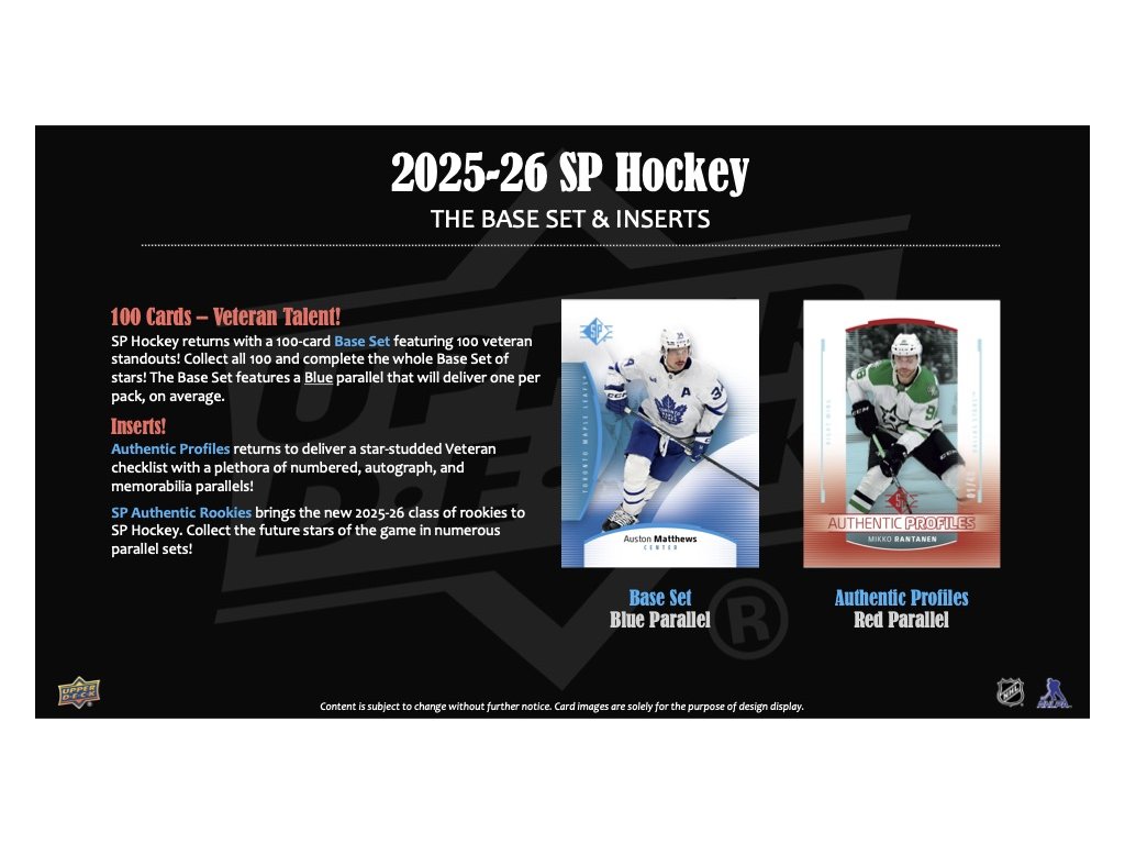 Dokončete základní set 140 karet, který se skládá ze 100 karet veteránů a 40 limitovanými kartami SP Rookies Authentics, které obsahují ty nejlepší nováčky v sezóně 2025-26!