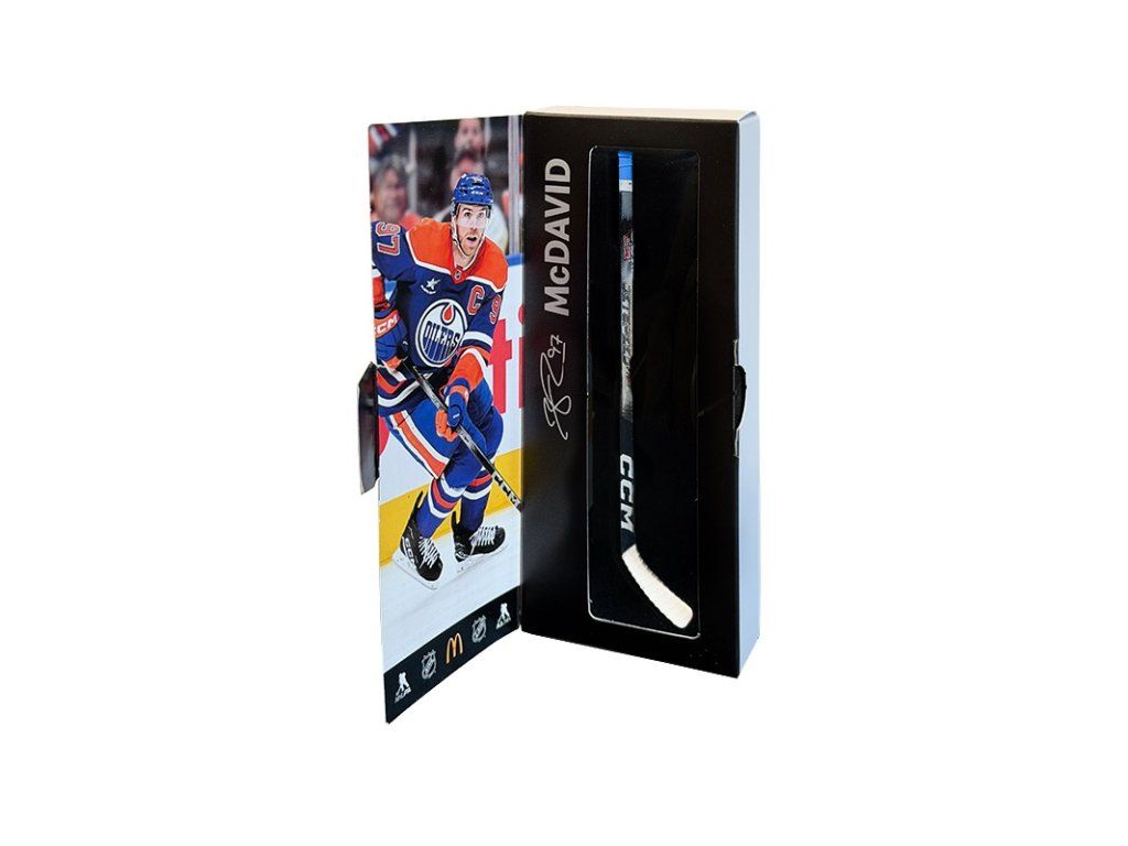 V balíčku najdete mini repliku hokejky jednoho z těchto hráčů: Connor McDavid, Auston Matthews, Macklin Celebrini, Quinn Hughes, Cale Makar, Samuel Montembeault, Sam Reinhart